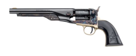 The 1858 New Army was used as a side arm by U.S. Troops in the Civil War. The cylinder has a rebated rear so that it will fit into the barrel for reloading. The barrel and cylinder are blued. The loading lever, hammer, trigger guard and back strap are case hardened with a brass trigger guard and grip straps. The one piece walnut grip is completed with a brass patch box.
